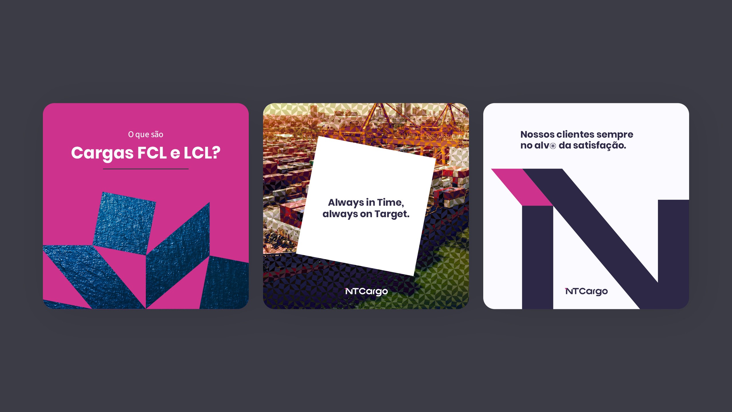 O desafio era desenvolver uma identidade visual que traduzisse o conceito 'Always on target', refletindo a precisão e eficiência que a NT Cargo oferece em suas operações de transporte aéreo, marítimo e rodoviário. Nossa abordagem focou em criar uma marca que comunicasse tanto especialização técnica quanto modernidade.